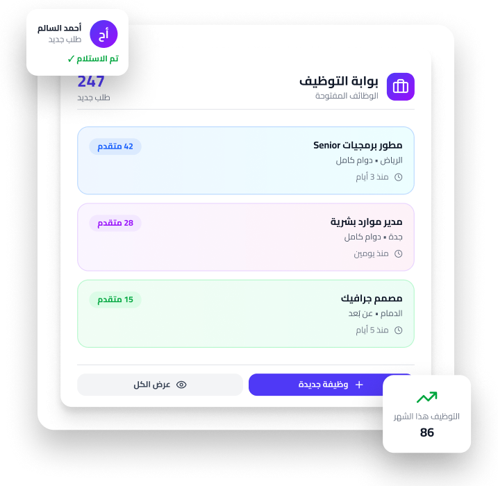 حوّل التوظيف إلى تجربة ذكية وسريعة واستقطب أفضل الكفاءات عبر نظام إدارة توظيف إلكتروني يؤتمت جميع الإجراءات، ويرفع كفاءة التعيين للجهات الحكومية والخاصة في السعودية عبر بوابة سحابية آمنة وسهلة الاستخدام.